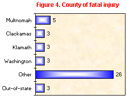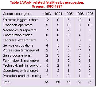 The work-related fatalities during the period from 1978-1997 show a gradual drop, with peaks in 1979 and 1983 (see Figure 1). The fatality rates in Figure 2 are the number of fatalities per 100,000 subject employees. The employment figures are estimated workers' compensation covered employment based on data supplied by the State of Oregon Employment Department. The 1997 rate is based on preliminary employment data. ![]() ![]() The construction industry accounted for the highest number of fatalities, followed by the retail trade industry (see Figure 3). ![]() Transportation accidents, including three workers killed in aircraft accidents, accounted for the highest number of fatalities among all events. Six workers died from falls. In 1997, three workers were killed as a result of assaults or violent acts. No workers were killed as a result of workplace violence in 1996. ![]() Multnomah County had the highest number of fatalities in the state (see Figure 4). Other counties which registered three or more fatalities in 1997 were Clackamas, Klamath, and Washington. Three fatalities occurred out-of-state. ![]() Transportation operators accounted for the highest number of fatalities, followed by the construction trades among all occupation categories in 1997 (see Table 3). Precision production and mining occupations recorded no fatalities. ![]()